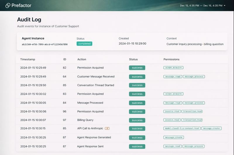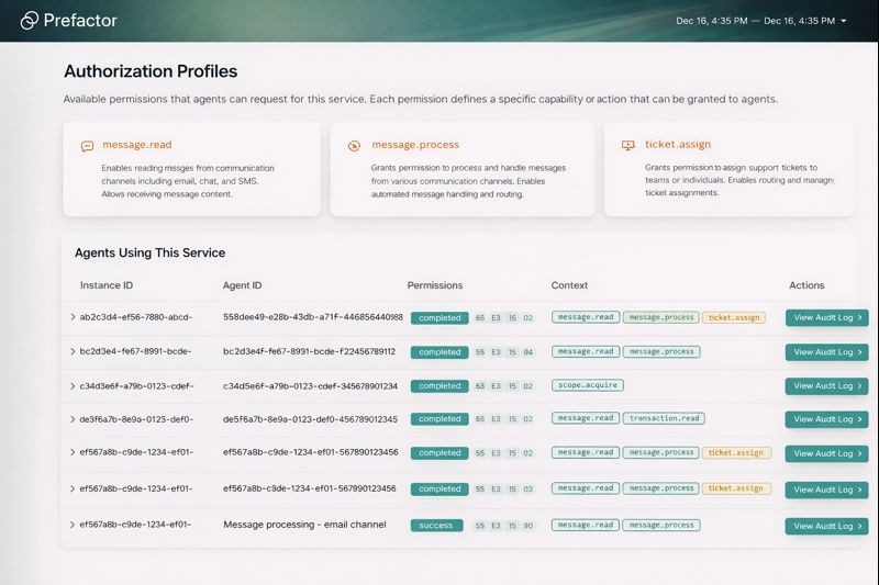 Stop rebuilding agent governance from scratch. Prefactor provides enterprise-ready infrastructure for agent identity, access control, and audit trails—so you can focus on building agents, not securing them.